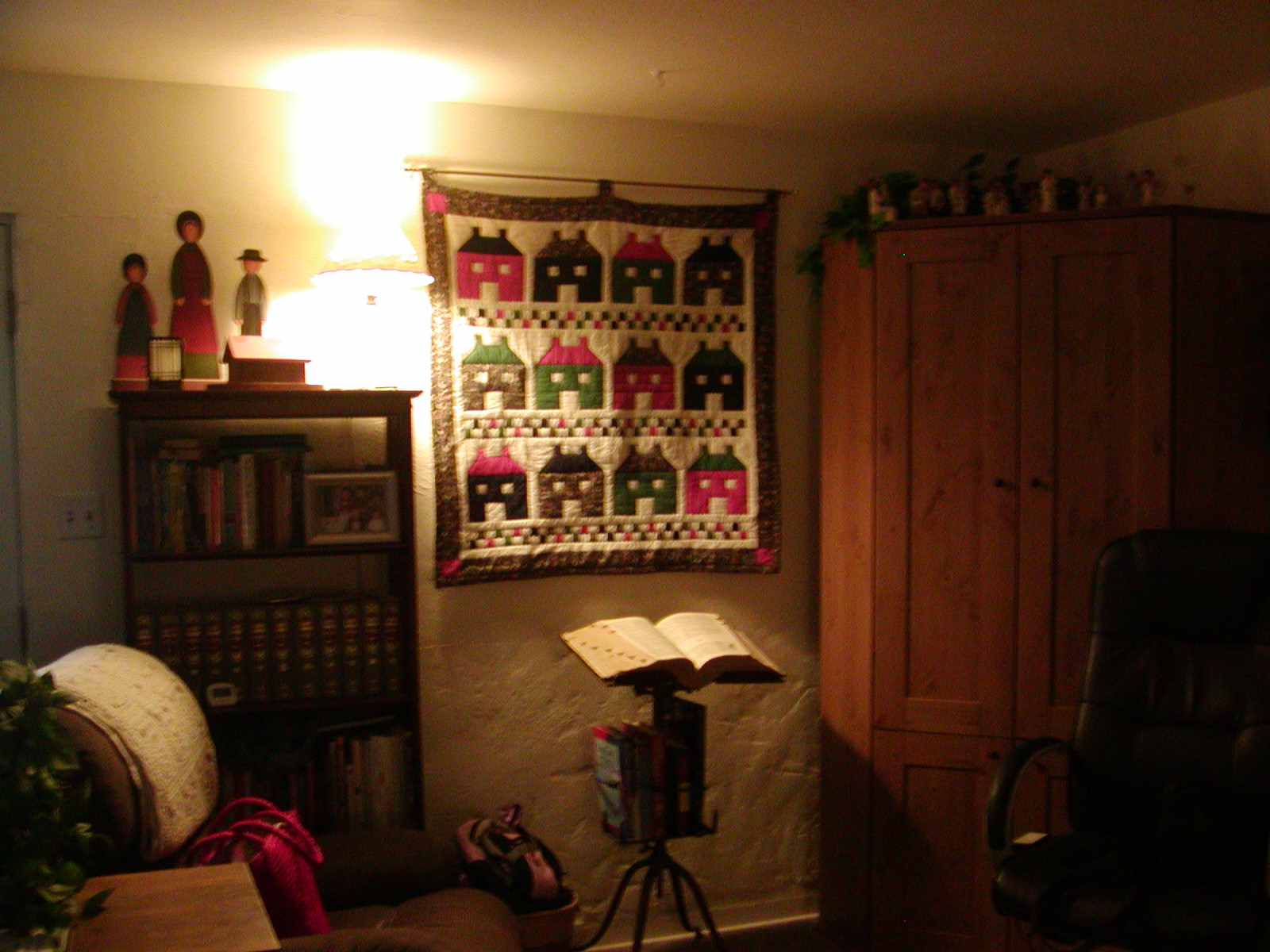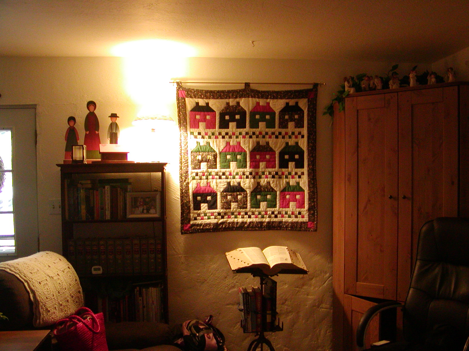 When we got home from church, Hubs hung the quilt in the living room. :) It was a gift in 1997 from Yvonne Waugh (fondly referred to as “Gramma Vonne” in our home) when we lived in The Dalles, OR. I love it! And, this spot is just perfect for it!