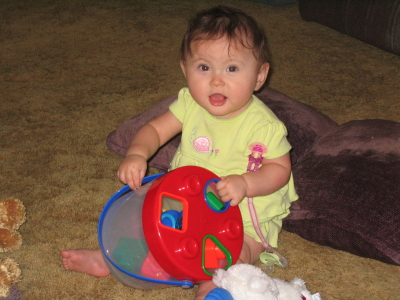 Today, an anonymous big brother was asked to watch the baby. This obviously was interpreted as “put the baby on the ground, surround her with toys and walk away”. :( I heard crying and turned around to find her head and shoulders in her toy bucket! No idea how she achieved that!
