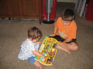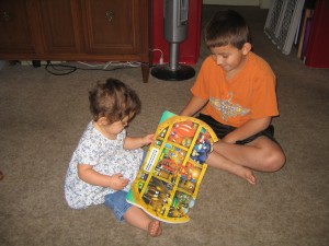 I caught this moment between J3 and JGirl. We’ve been talking about Noah’s ark for school and he was helping her learn the story. It was so cute – she’d growl at the bears! LOL
