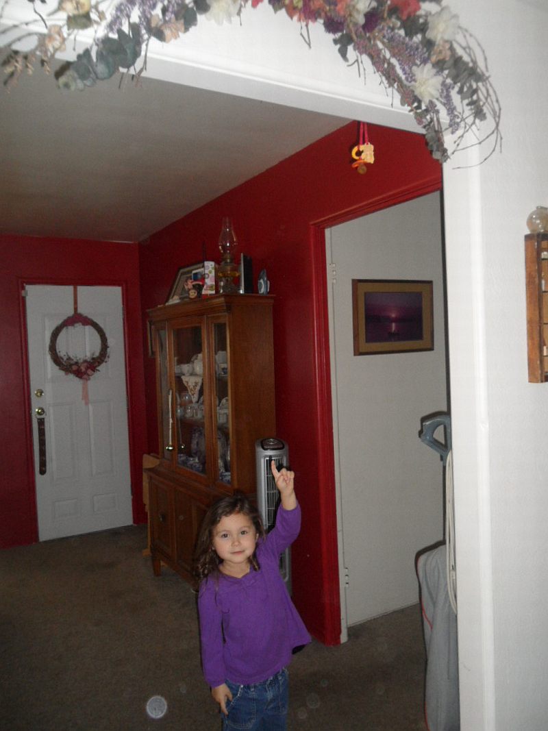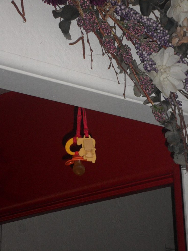 Our latest home decoration….her “Paci”.  She can have it at bedtime and naptime (for now) but she can’t have it all day long as she’d prefer.  And there is NO chair in the house which she can climb on to reach it.  (insert evil Momma cackle here! 😉