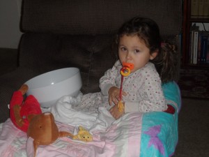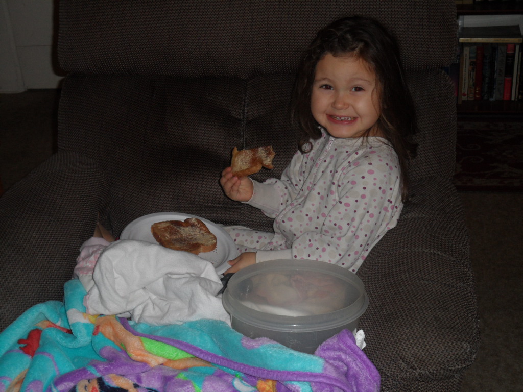 At 5am this morning, I was woken up by the horrible sounds of the stomach flu … and it was RIGHT beside me. :( Sissy(3) had climbed into our bed – probably wasn’t feeling well – and then was sick. Poor thing.