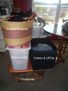 • The Christmas tub is out in the game room. The Current projects basket is in the living room. The other containers are in my room… two of the boxes are in a shelving until – then white shelving is by my bed and the black box containing the cotton is at the foot of my bed. I’ve considered some of those bags which you can suck the air out of them for yarn storage, but haven’t convinced myself it’s worth it.