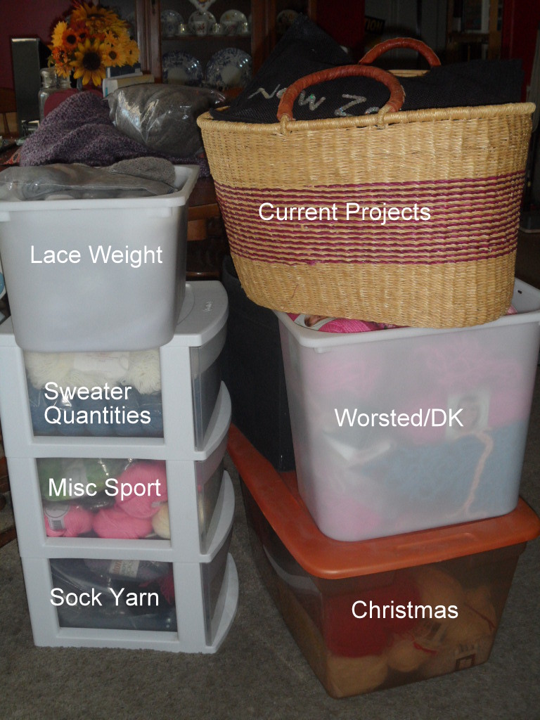 So, I destashed a bit – I emptied one whole Rubbermaid bin and organized my yarn! Check it out: