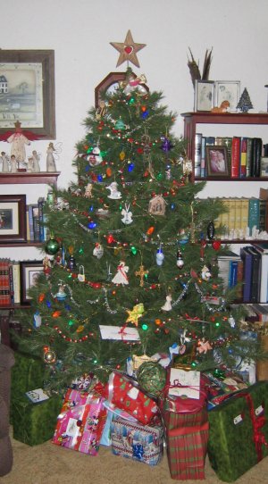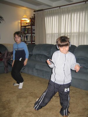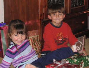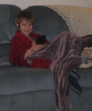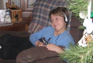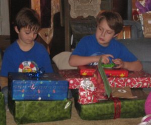 Sunday we all woke up feeling horrible so we stayed home and then had a change of plans which meant I had to bundled up all my ingredients and head to my friends house for lunch. Another nice meal and gift exchange. She, as my knitting friend, got my some Trekking sock yarn that I can’t wait to cast on!! π No photos this day as I was feeling lousy and well, we just weren’t in picture mode I guess. That night we went to church for our candlelit Christmas program – lovely! Christmas music by candlelight with a few 100 of your favorite people! Then home to stuff stockings and do our last advent candle and sing while sitting by the Christmas tree. Magical!The next morning we were up and opened gifts with our boys. All three got MP3 players and really enjoyed them! I gave DH the first two seasons of House – I hope he enjoys it but so far there’s been no time to check it out!