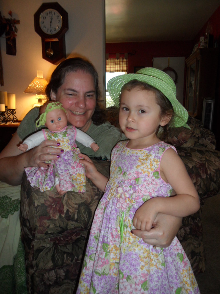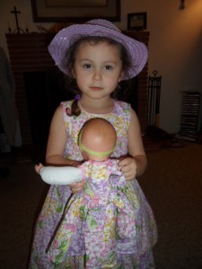 Yesterday, my friend, Ruth, came over with a box for Sissy.  It was an early (about 3 mos!) birthday present!  And, it is perfectly timed so that I don’t have to worry about finding her a new dress for Easter!