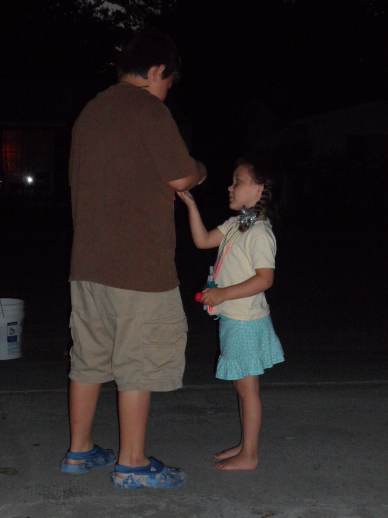 After a BBQ at the inlaws, we came home and as soon as it was dark J2 and J3 got ready to light the fireworks (J1 went to the local high school to meet up with some friends).  Cousin C came over – we lite our fireworks and then sat on our lawn to watch the fireworks the city put off! It was a great time!! 🙂