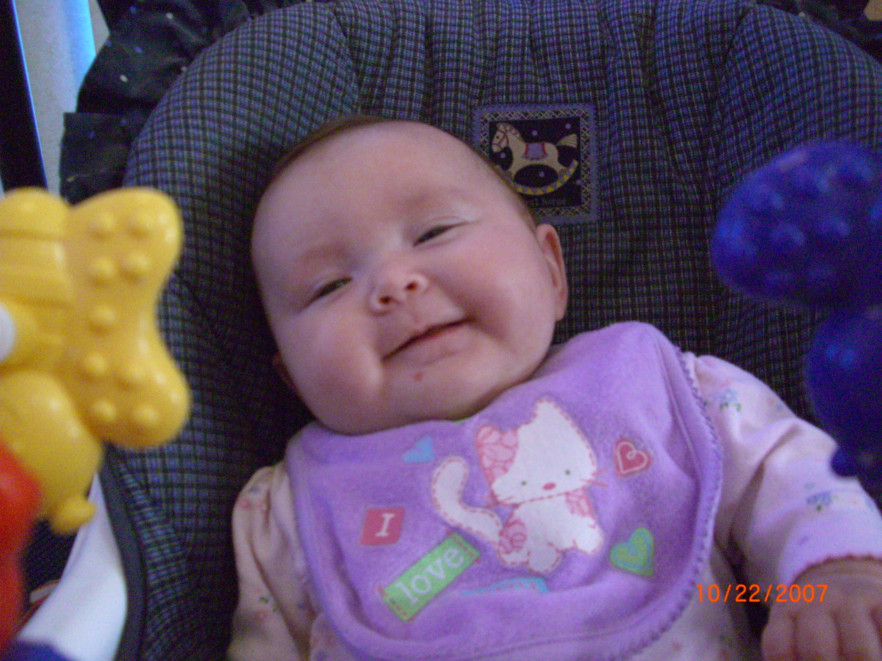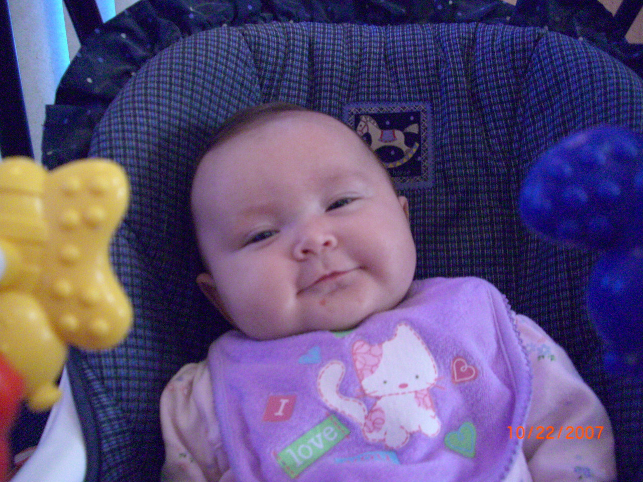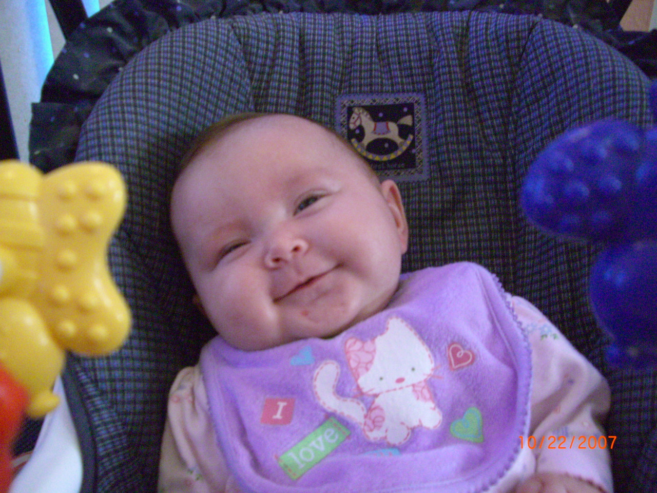 22Oct 2007 YEAH!! by Amy ⋅ 6 Comments I got more pics!! And a quick update on how she is doing! She turns 3 mos tomorrow! In these pictures taken today, her foster mom says she was talking to her: Share this:TweetShare on TumblrPrintMoreEmailLike this:Like Loading... Related Posted in: Family Life
