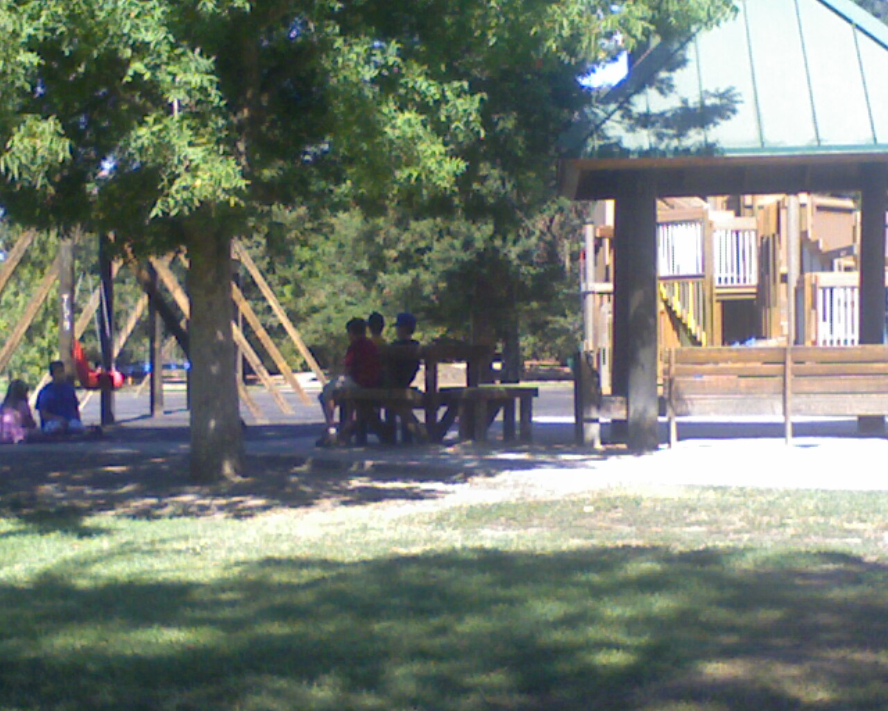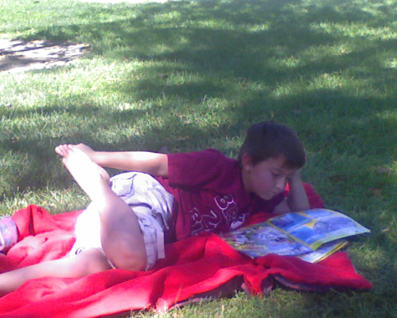 This week we went to the homeschool park day – after a quick trip to the library.  We were the only ones there for awhile – so J3 found a shady spot to look at his pirate book.